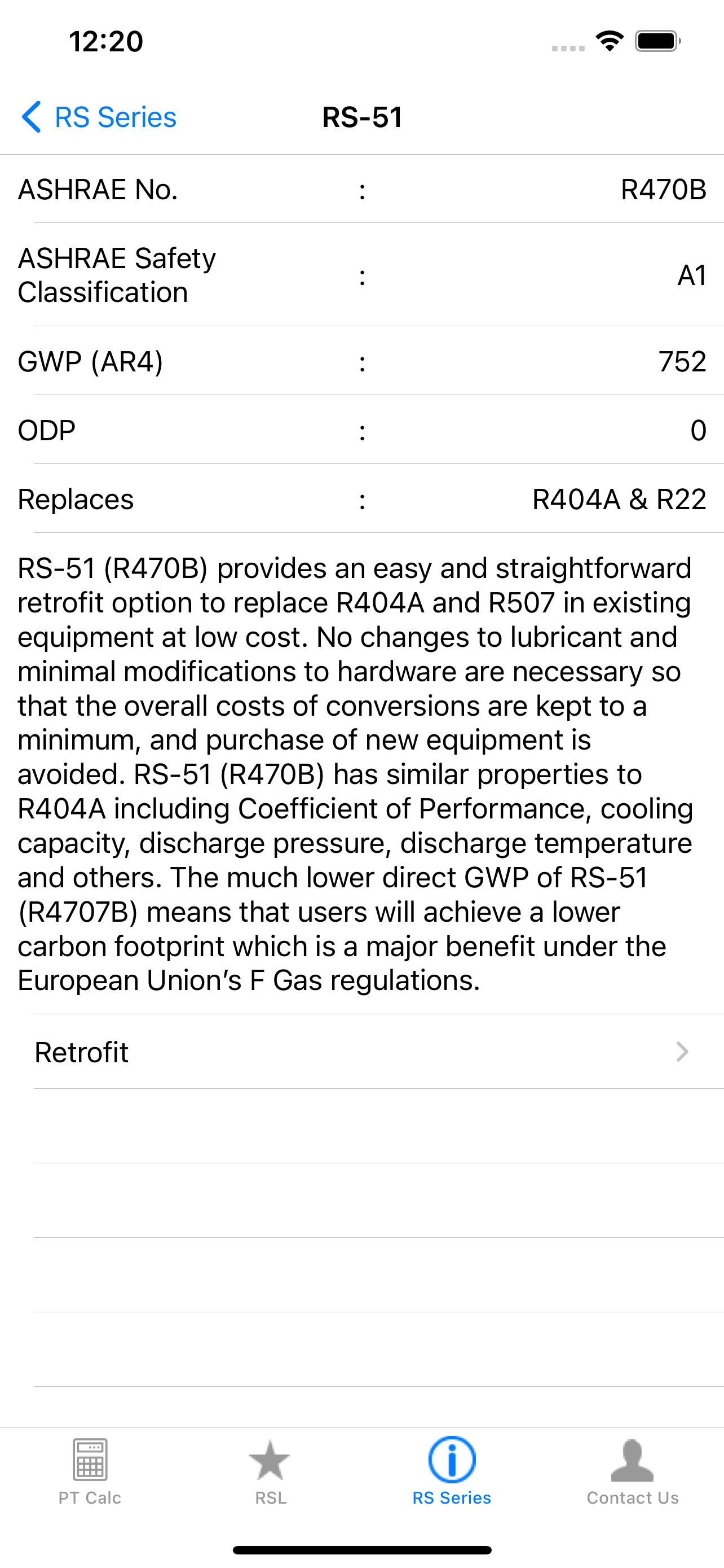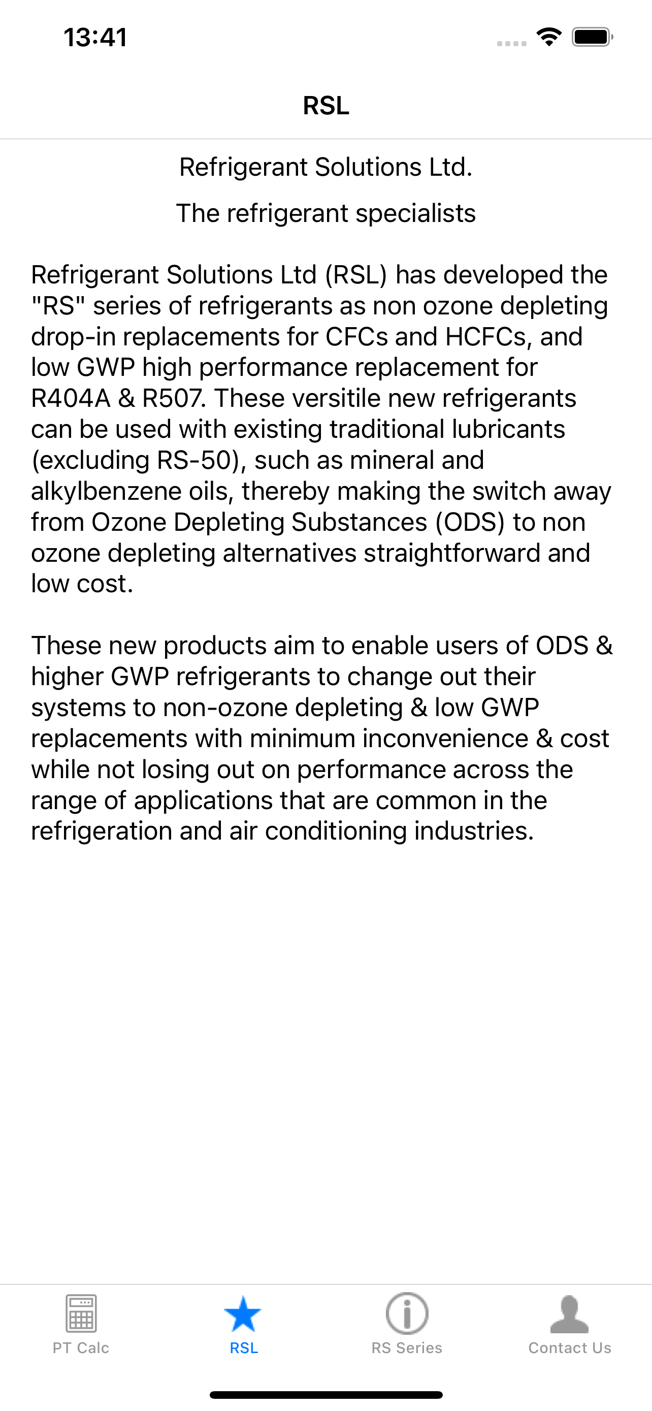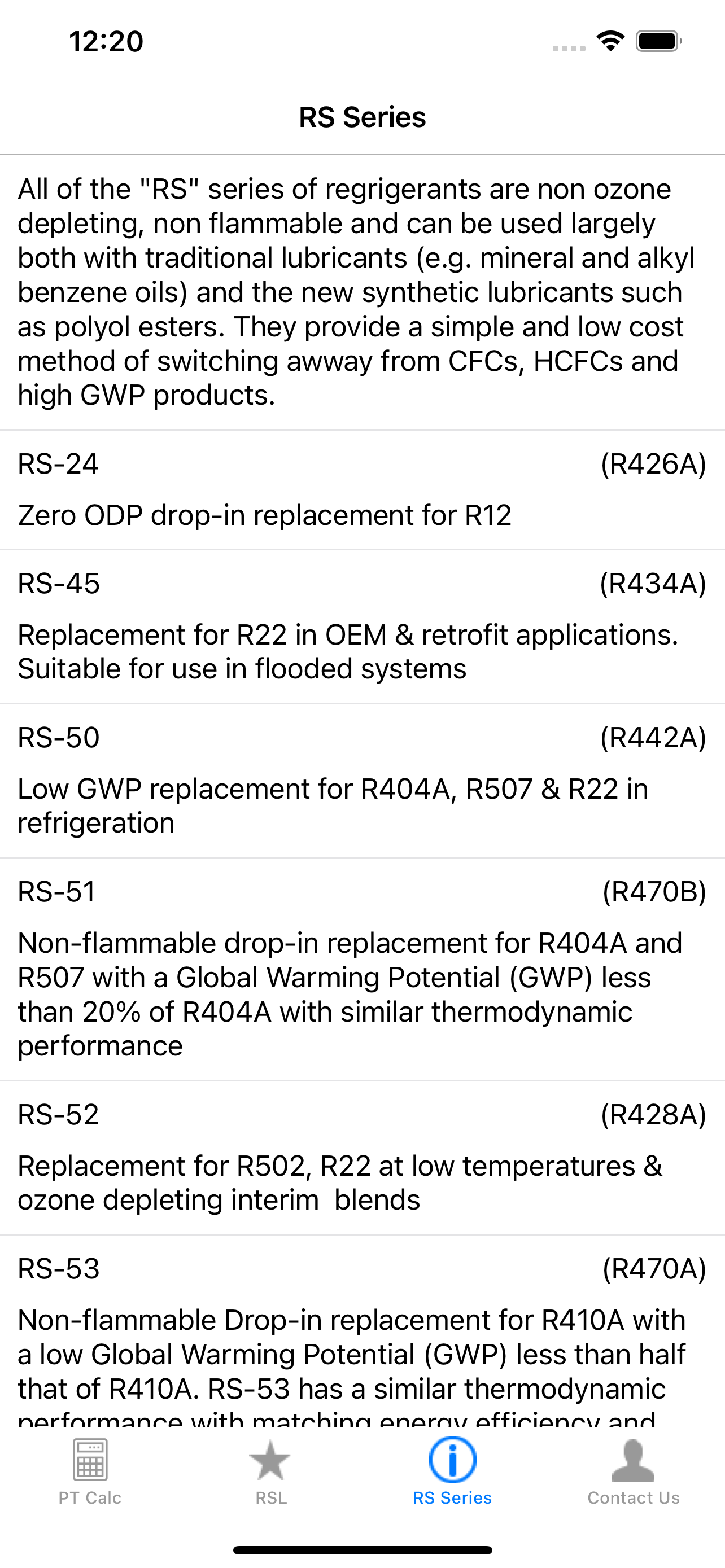 RSL is pleased to offer an iOS application for the RS series of refrigerants. The app provides the following: